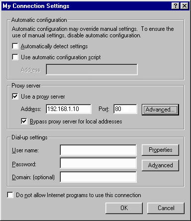 Note: when using IE5 on the machine MailGate is running on, the browser will use the ISP connection rather than go through MailGate - causing MailGate to timeout and close the connection. You will need to apply these settings:
