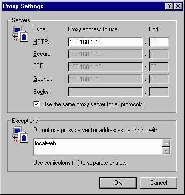 - Next click on the Advanced button, select "Use the same proxy server for all protocols", and enter the IP address(es) or name(s) of any Website(s) on your local Web server (if applicable).
