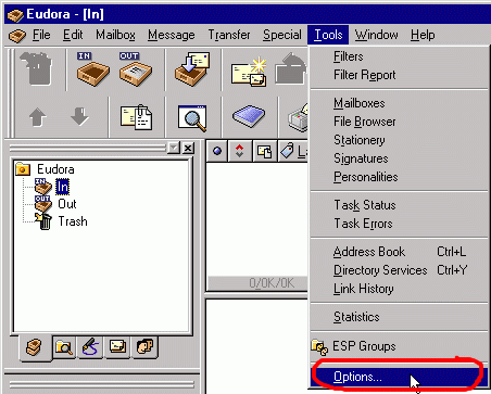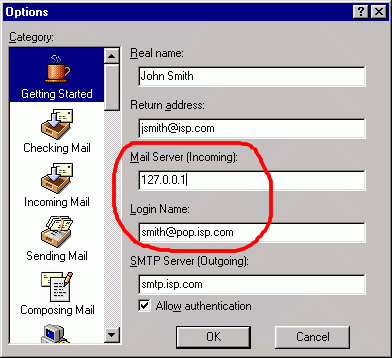 SpamWeasel Support Issues Eudora configuration 1 Click on Tools | Options. ![]() 2 The Options screen will appear, showing your current settings. ![]() 3 At the end of the "Login name" field, type an "@" sign, followed by the contents of the "Mail Server (Incoming)" field. Next, change the "Mail Server (Incoming)" field to "127.0.0.1". ![]() 4 Select the "Checking mail" option, in the left-hand pane. Then click on the drop-down menu with the title "Secure sockets when receiving", and select "Never". Click OK to apply the settings. ![]() Timeouts You may wish to change the timeout setting in your e-mail client. More information on why this may be required can be found here. To change the timeout settings, scroll down the list on the left-hand side, and select "Network". You can increase the timeout setting here. ![]() |