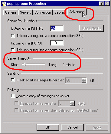 SpamWeasel Support Issues Outlook Express configuration 1 Click on Tools | Accounts. ![]() 2 Double-click on the account you wish to use with SpamWeasel. ![]() 3 On the screen that appears, select the "Servers" tab. This will show your current settings. ![]() 4 At the end of the "Account name" field, type an "@" sign, followed by the contents of the "Incoming mail (POP3)" field. Next, change the "Incoming mail (POP3)" field to "127.0.0.1". Click OK to apply the settings. ![]() Timeouts You may wish to change the timeout setting in your e-mail client. More information on why this may be required can be found here. To change the timeout settings, select the "Advanced" tab. You can increase the timeout setting here. ![]() |