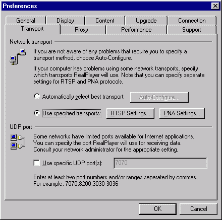 MailGate Support Issues Q. How do I set up MailGate to proxy RealPlayer 8 A. Realplayer 8 can be set up to work via the HTTP proxy. Warning - Enabling Real Player to run in the System tray could initiate unwanted proxy connections. With a dial-up connection this could lead to some large phone bills. RealPlayer setup In the RealPlayer application on the client machine, click View | Preferences and select the Connection tab. Set the normal and maximum bandwidth to suit your LAN. ![]() ...next, select the proxy tab, and select either "Use my Web browser's HTTP proxy" or select "Manually configure HTTP proxy" and specify the IP address of the MailGate machine and the HTTP port (usually 80) as shown in the fields below: ![]() ...next, select the Transport tab, select "Use specified transports"... ![]() ...click the RTSP Settings button, and configure as below: ![]() ...click OK, then click the PNA Settings button, and configure as below: ![]() |