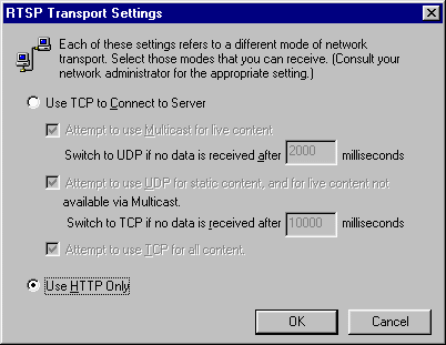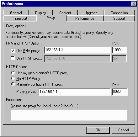 MailGate Support Issues Q. How do I set up MailGate to proxy RealPlayer G2 A. MailGate provides a built in proxy for use with RealPlayer. Warning - Enabling Real Player to run in the System tray could initiate unwanted proxy connections. With a dial-up connection this could lead to some large phone bills. Proxy requirements - RealPlayer connects through MailGate using the Realtime AV protocol. It also requires DNS access through the DNS relay option Realtime AV proxy In MailGate, click on Gateway|Setup, and select the Realtime AV tab. Check the "Enable..." box. RealPlayer setup In the RealPlayer application on the client machine, click Options|Preferences and select the Connection tab. Set the normal and maximum bandwidth to suit your LAN. ![]() ...next, select the proxy tab, and configure as below (entering the IP address of the MailGate machine in the fields containing '192.168.1.1'): ![]() ...next, select the Transport tab, select "Use specified transports"... ![]() ...click the RTSP Settings button, and configure as below: ![]() ...click OK, then click the PNA Settings button, and configure as below: ![]() |
