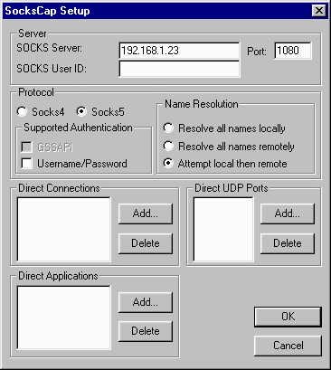 MailGate Support Issues Q. How do I set up the SocksCap Socks client to work with MailGate? A. Details of how to download and install SocksCap with MailGate can be found below. SocksCap Socks Client SocksCap is an application that resides on any client machine needing to use the Socks protocol. It enables TCP and UDP client applications to traverse a Socks firewall. SocksCap intercepts the networking calls from WinSock applications and redirects them through the Socks server without any modification to the original applications or to the operating system software or drivers. The way that Socks access is provided is that any applications requiring Socks access will need to be added individually to the SocksCap Control Panel, and will need to be initiated from within it (by double-clicking it's icon from within the SocksCap Control Panel). There are two flavours of SocksCap: SocksCap16 - for 16 bit applications - Win3.1 and Windows for Workgroups 3.11 SocksCap32 - for 32 bit applications - Win95/98//ME/NT/2000 or XP MailGate Setup In MailGate, click on Gateway | Setup, and select the Socks tab. Enable either version 4 or 5 (5 is recommended). Downloading Sockscap You can download the appropriate version of SocksCap from www.socks.nec.com/cgi-bin/download.pl. When downloaded, run the Installation file on any machines that require the Socks client. configuration instructions can be found below. Setup ![]() Click on File|Setup... ![]() ... enter the IP address of MailGate into the "Socks Server" field, set the port to "1080". Select the version of Socks that you wish to use, and set the Name Resolution to "Attempt local then remote". Then click OK. ![]() On the main screen, click the New button, then click the Browse button. Find the location of the application you wish to run through Socks, and double-click on it. The application will then be added to SocksCap, and you can run it by double-clicking on the icon in the main screen. Information on SocksCap, how to use it, and FAQ's can be found at www.socks.nec.com. |