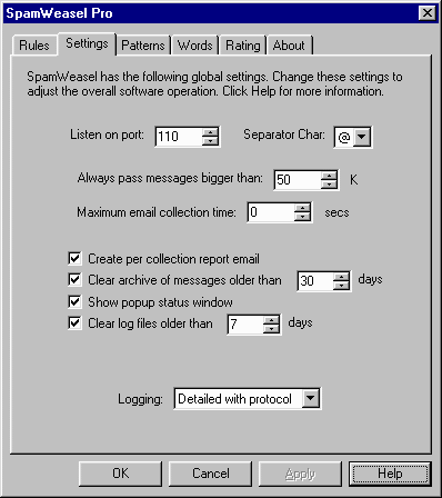 SpamWeasel Support Issues Q. Why am I having trouble collecting mail with SpamWeasel Pro? A. If there are a large number of e-mails to collect from your ISP, your e-mail client can time-out before SpamWeasel Free has collected them. When your e-mail client requests a POP collection, SpamWeasel goes out to collect the data from your ISP POP account. Because of the way POP3 works, and because SpamWeasel may be configured to not pass some mail through, SpamWeasel can't reply to your client until it has finnished checking all the mail collected. Unfortunately the POP3 protocol has no facility to keep the connection between your client and SpamWeasel alive, and while SpamWeasel is busy collecting mail from your POP account the e-mail client could timeout while waiting for a response. Keeping the connection alive SpamWeasel Pro sends a "." character every so often to preserve the connection between client and SW. Not all clients recognise this process and will still need the timeout setting increased (see below). Mail clients that support SpamWeasel's method of keeping the connection alive are listed below: Eudora Calypso 3 PoCo Mail Incredi Mail Xe Netscape/Mozilla Setting the Maximum E-mail Collection Time If your e-mail client doesn't support the keep-alive feature, the second option is to use the "Maximum e-mail collection time" setting. The value for this should be set to around 10 seconds less than the timeout setting in your e-mail client (see the e-mail client configuration section for details on how to check your timeout setting). ![]() When this option is set, SpamWeasel will stop collecting mail once the timeout is exceeded, and the remaining mails will be collected next time your e-mail client does a collection. This option is disabled when the "Maximum e-mail collection time" value is set to "0" (which is the default setting). |